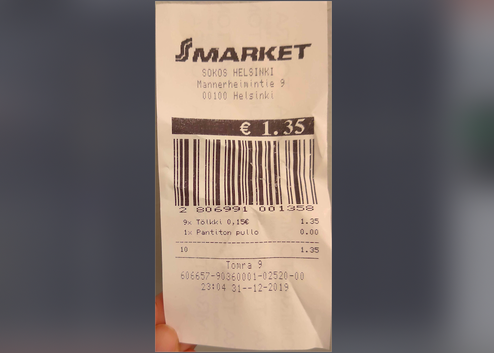 Setelah kami rasa cukup, kami langsung menuju bawah tanah tempat supermarket S-Market di Rautotiantori melakukan penukaran. Ada antrian yang cukup panjang, saya tukarkan beberapa botol dan kaleng lalu mengambil kupon dari dalam mesin yang dapat dipakai untuk belanja lalu mencuci tangan di wastafel samping mesin. Dari 9 kaleng dengan masing-masing deposit 0.15 sen yang berhasil ditukar, sisanya karena rusak sehingga tidak dapat deposit, kami memperoleh total voucher 1.35 Euro dari setoran sampah ke mesin di S-Market. Berikut gambar kuponnya.